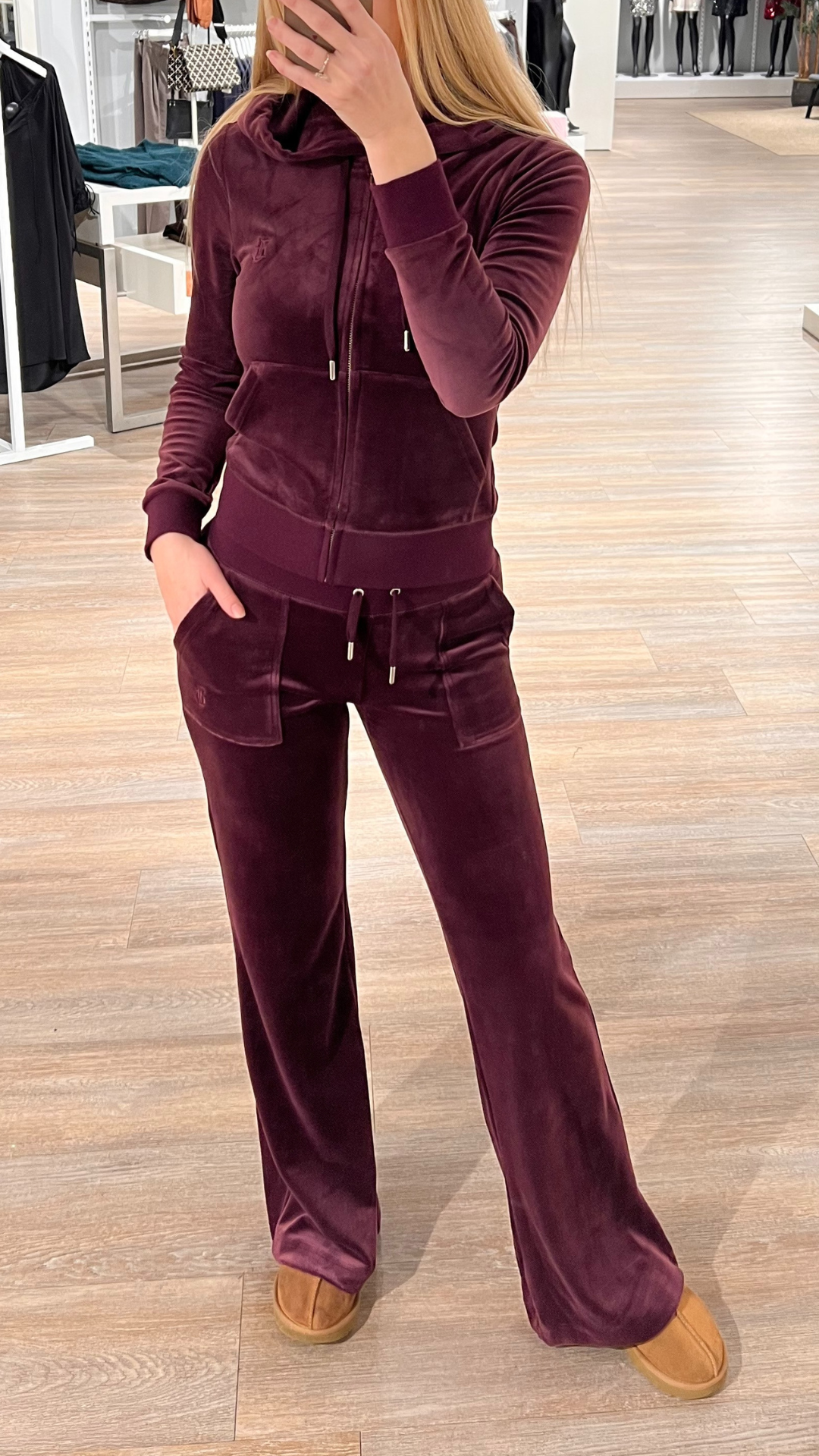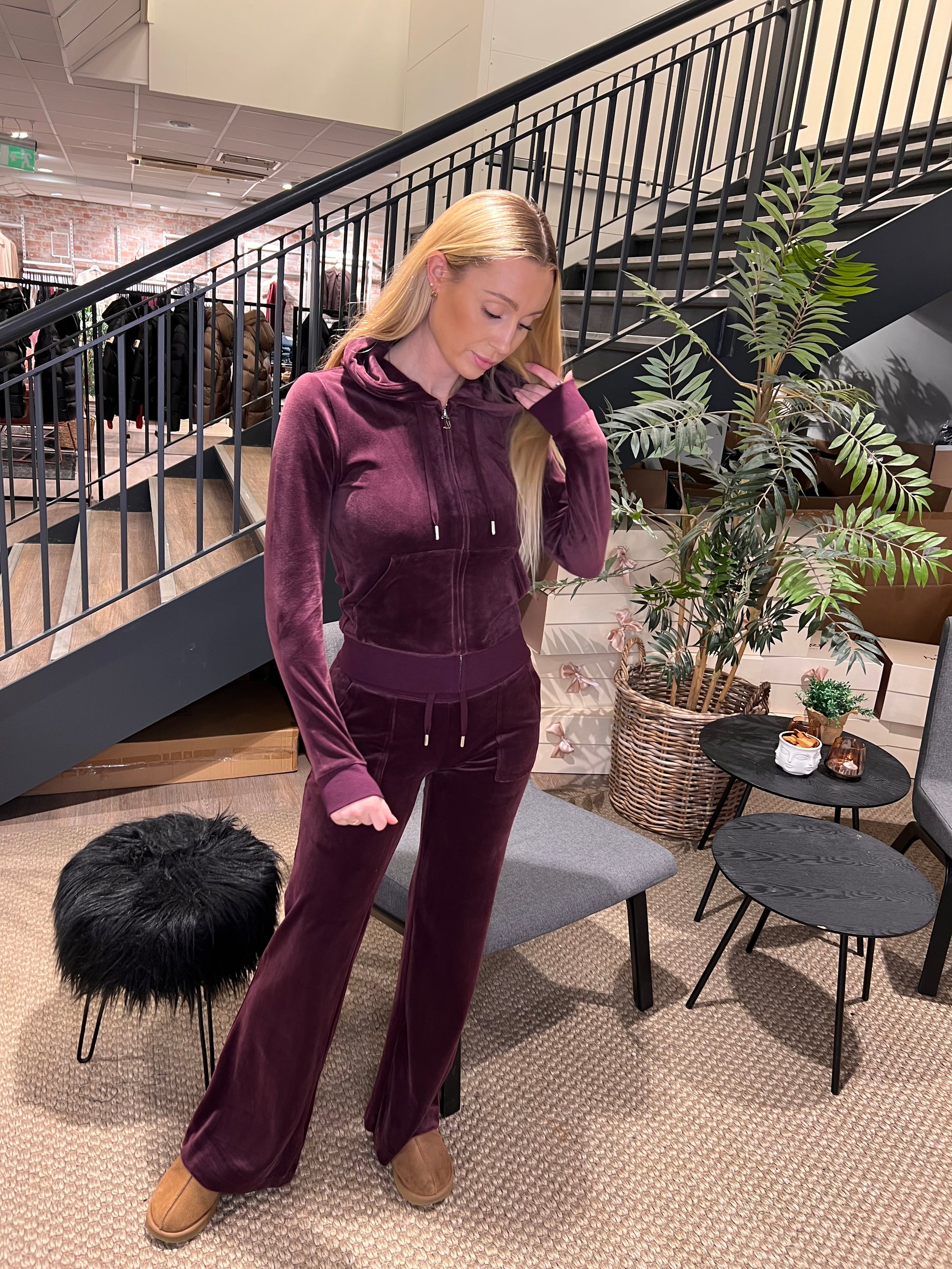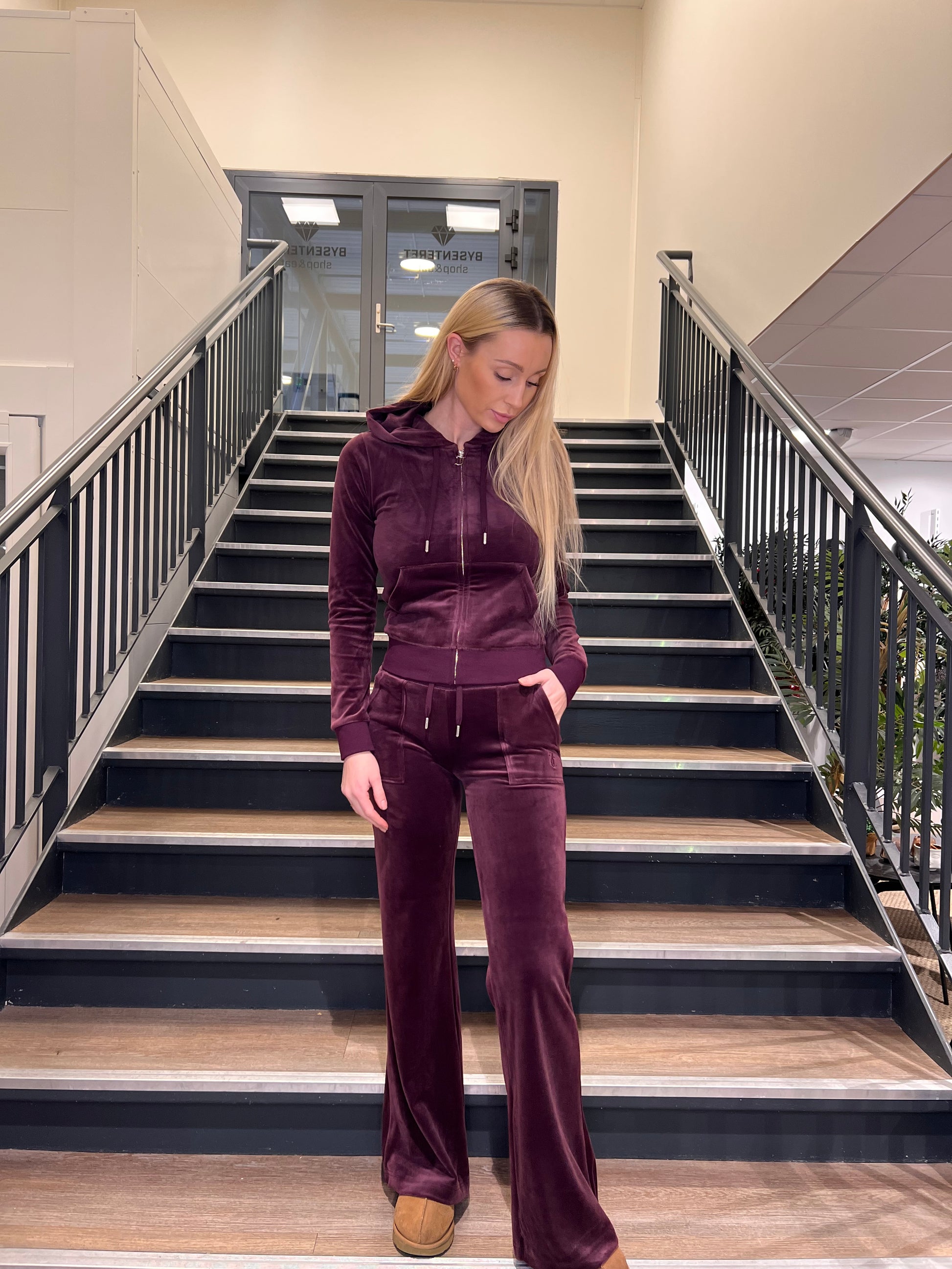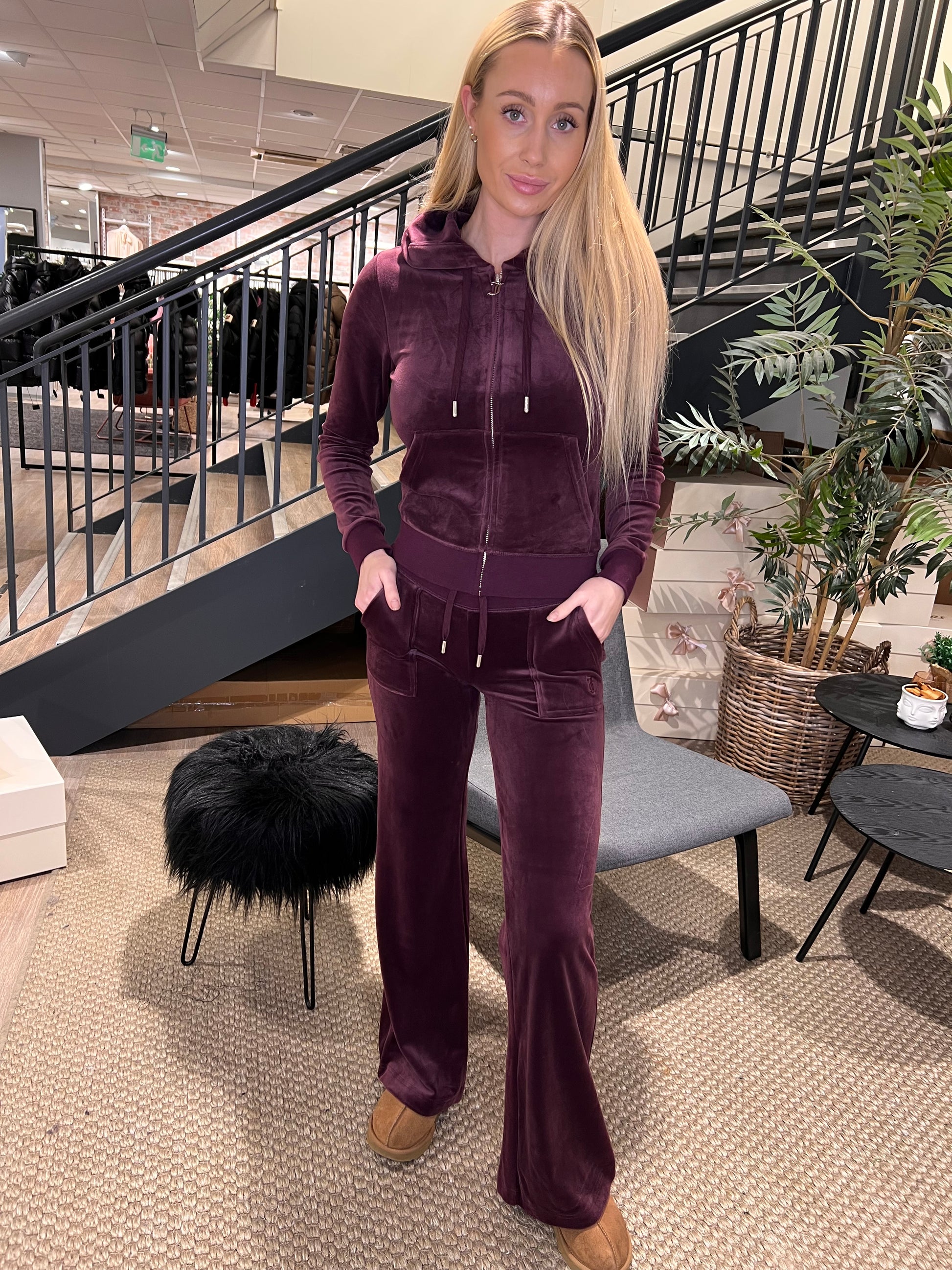 Joggebukser med lav midje i klassisk velur i den dype fargen Winetasting. Modellen har utsvingte ben, ribbestrikket midje med justerbar snøring og karakteristiske frontlommer. Buksen tilhører Juicy Couture Black Label-kolleksjonen og har baklommer med trykknapper, sølvfarget logodetaljert hardware og en ton-i-ton brodert JC-logo ved hoften.