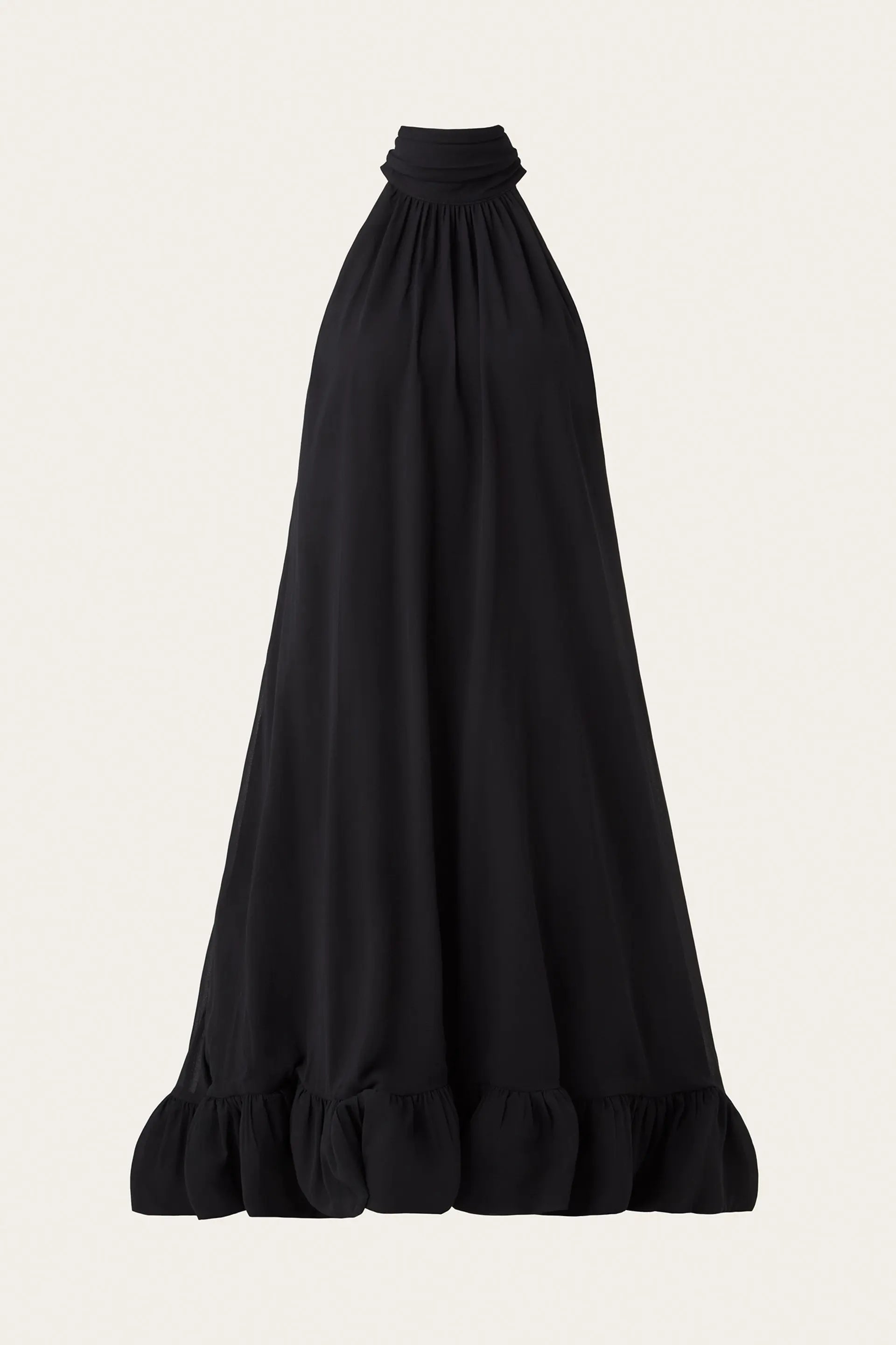 Nydelig halterneck kjole som knytes i nakken og som har en bølgete skjørtekant. Kjolene har åpen rygg og lukkes med glidelås bak. Kan brukes med eller uten belte.