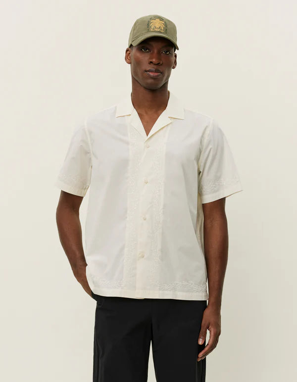 En nostalgisk klassiker i poplin, laget av 100 % økologisk bomull. Denne skjorten har delikat blomsterbroderi på sømmene, camp-krage, plissert bærestykke og rett fåll for en tidløs og sofistikert stil.