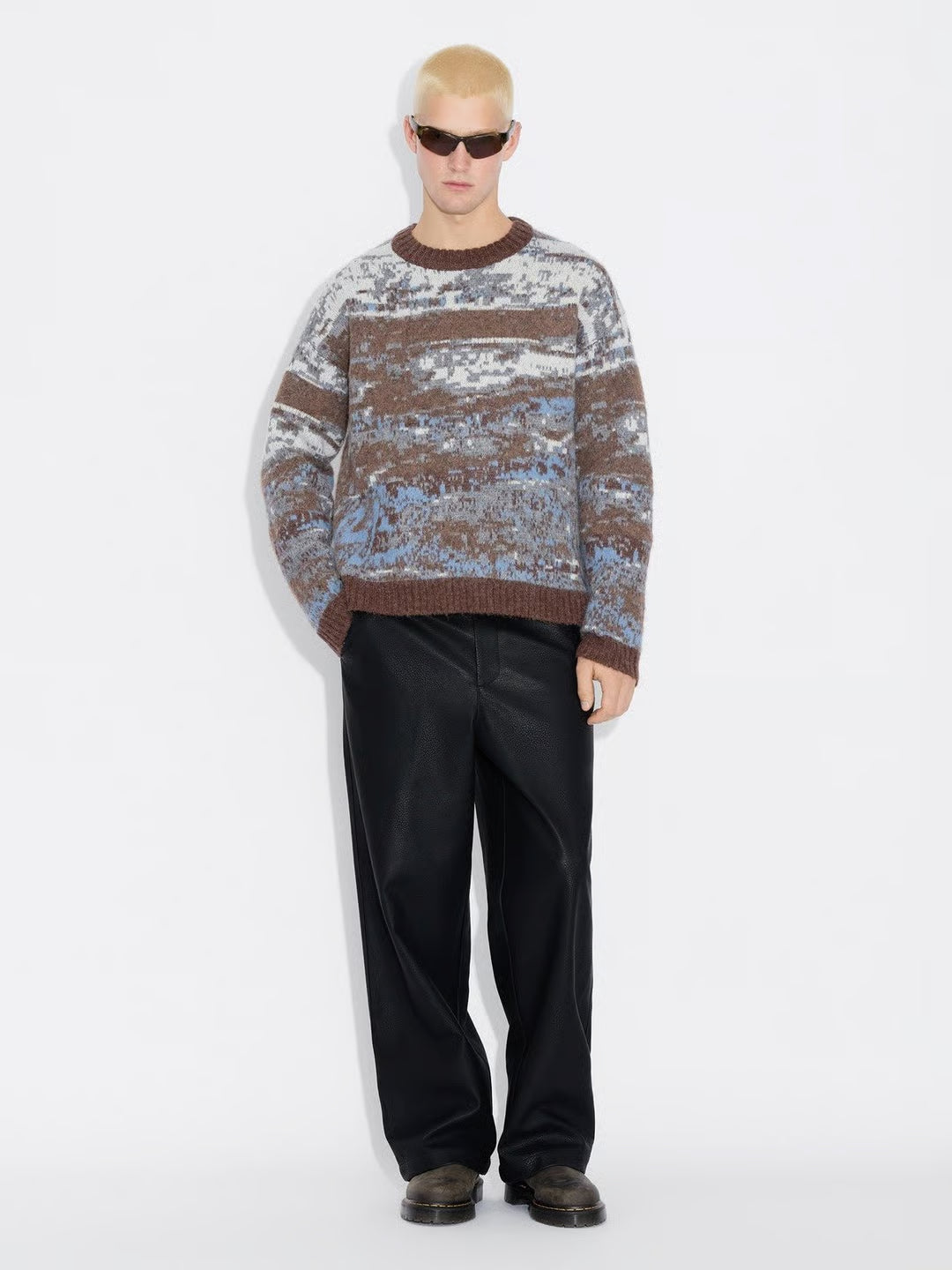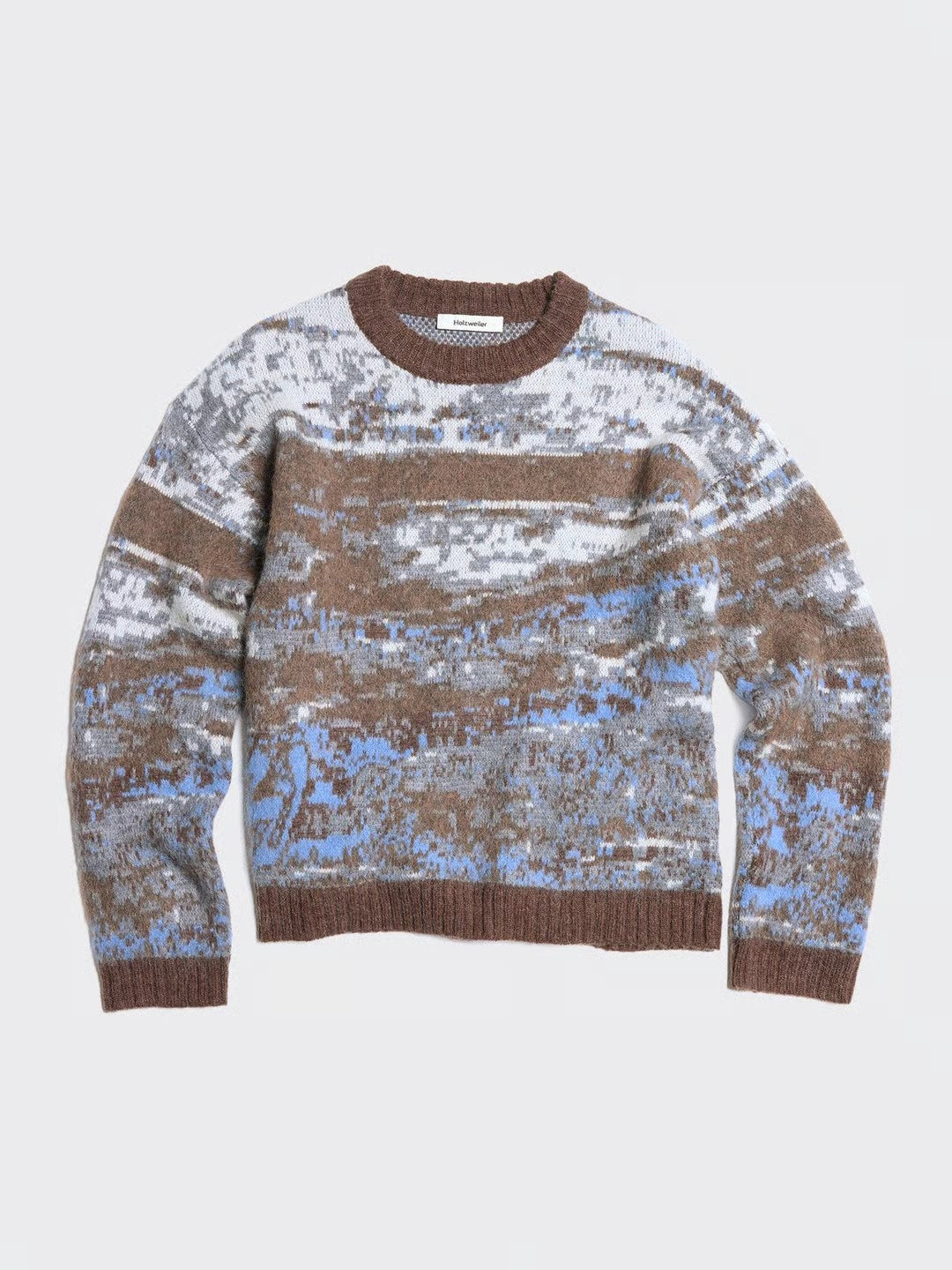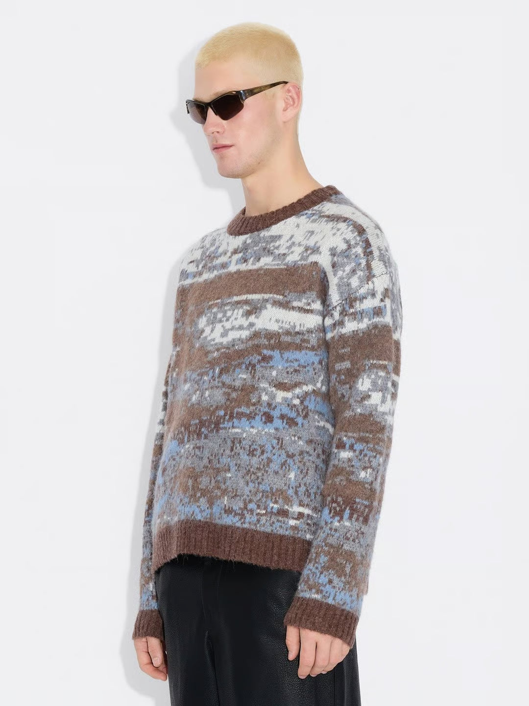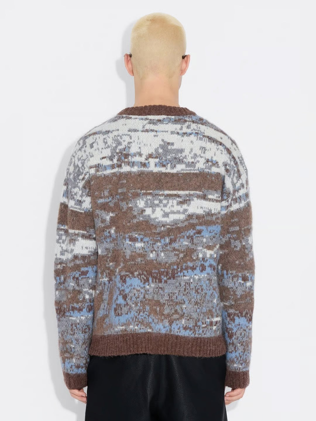 Arvy Landscape-genseren er laget i en ullblanding og preges av et heldekkende jacquardmønster som viser et snødekt fjellandskap. Denne oversized modellen har rund hals og ribbestrikkede kanter.