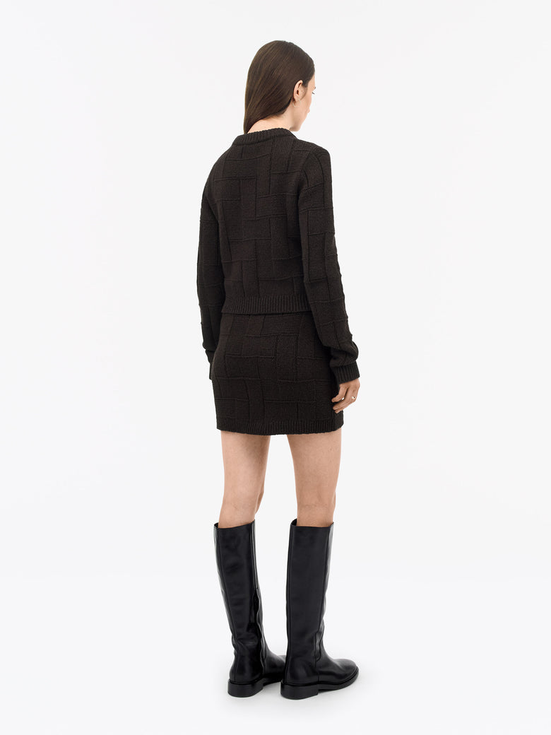 Cherry-skjørtet er laget av en myk garnblanding av bomull og ull, og har en rik, teksturert overflate. Det er strikket i en klassisk kurvvev-struktur som gir et subtilt, men særpreget uttrykk. Skjørtet er designet i en kort lengde og er ufôret for en lett og behagelig følelse. Det har en skjult, innvendig strikk i midjen for en jevn og komfortabel passform, og falden er pent avsluttet med en ribbekant som tilfører struktur og stil.