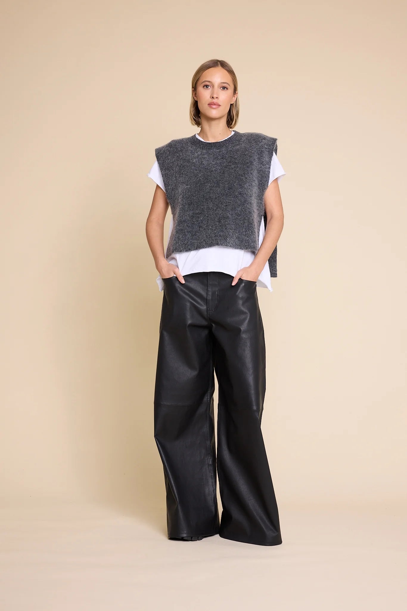 Vi introduserer Dog Vest – et av våre mest allsidige garderobe-essentials. Laget av en myk blanding av mohair og ull, med rund hals, hoftelengde foran og en litt lengre bakdel for en moderne og flatterende silhuett. Åpne sider med delikate knytebånd gir en raffinert detalj, perfekt for lag-på-lag på kjølige kvelder. Style den over favorittskjorten eller -blusen din for en uanstrengt, chic look.