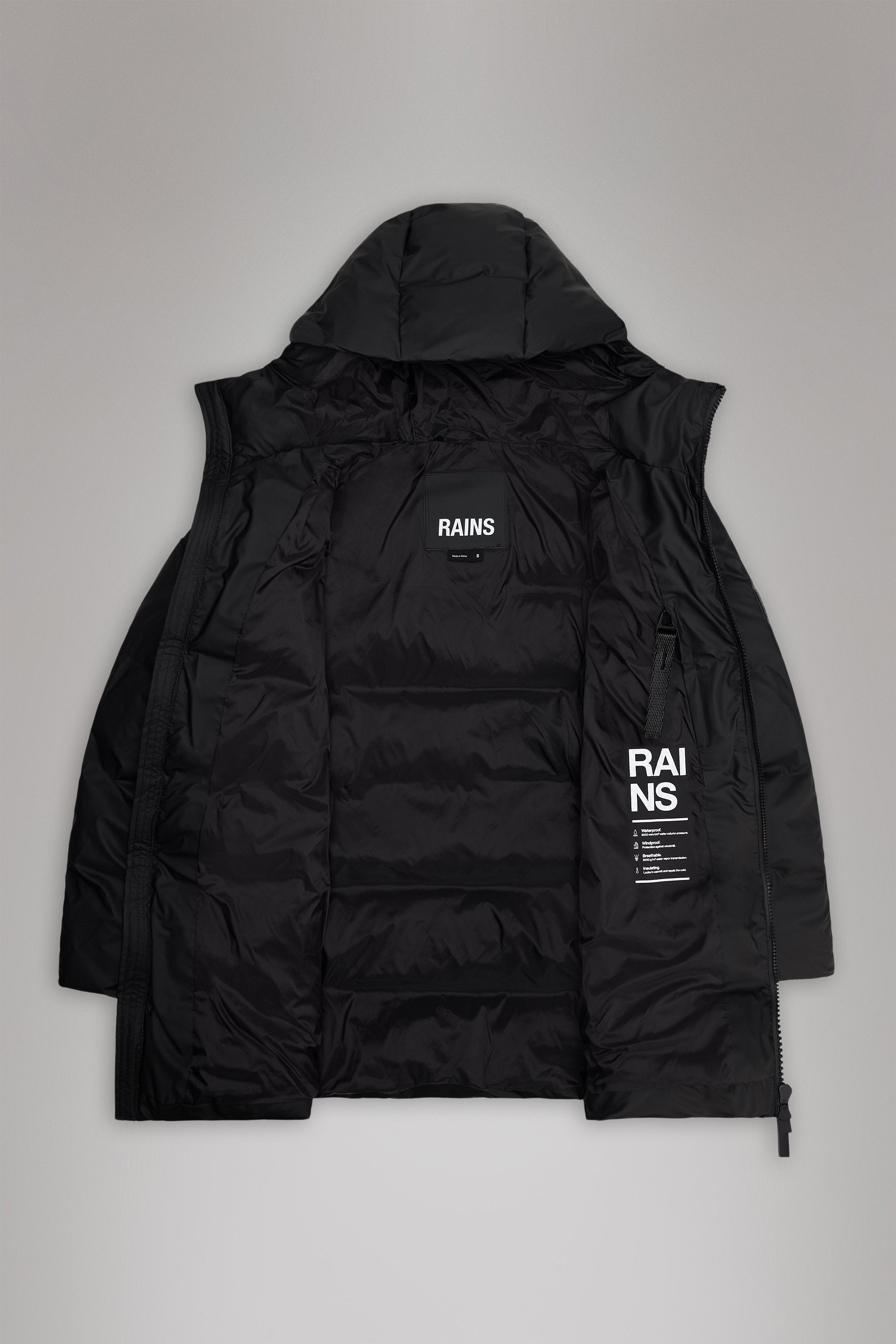 Denne eksklusive pufferen er bygget med vevd kammerteknologi og laget av Rains’ signatur-PU-materiale med doble, sveisede sømmer. Overflaten er lett og har en glatt finish.