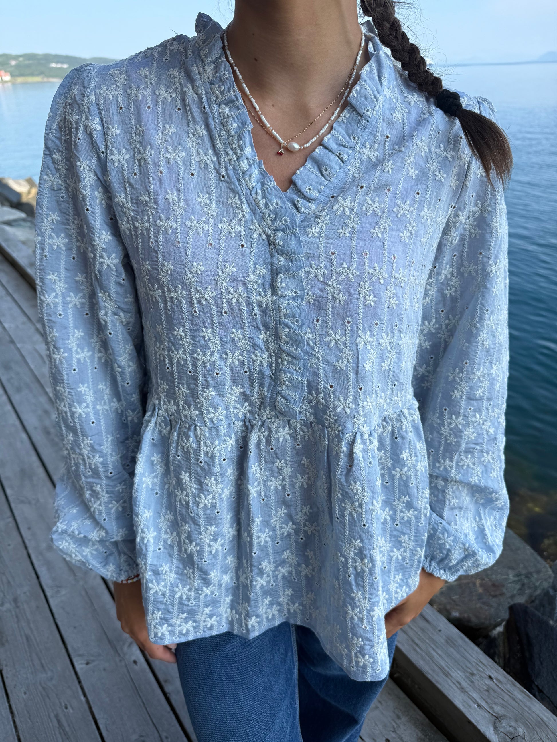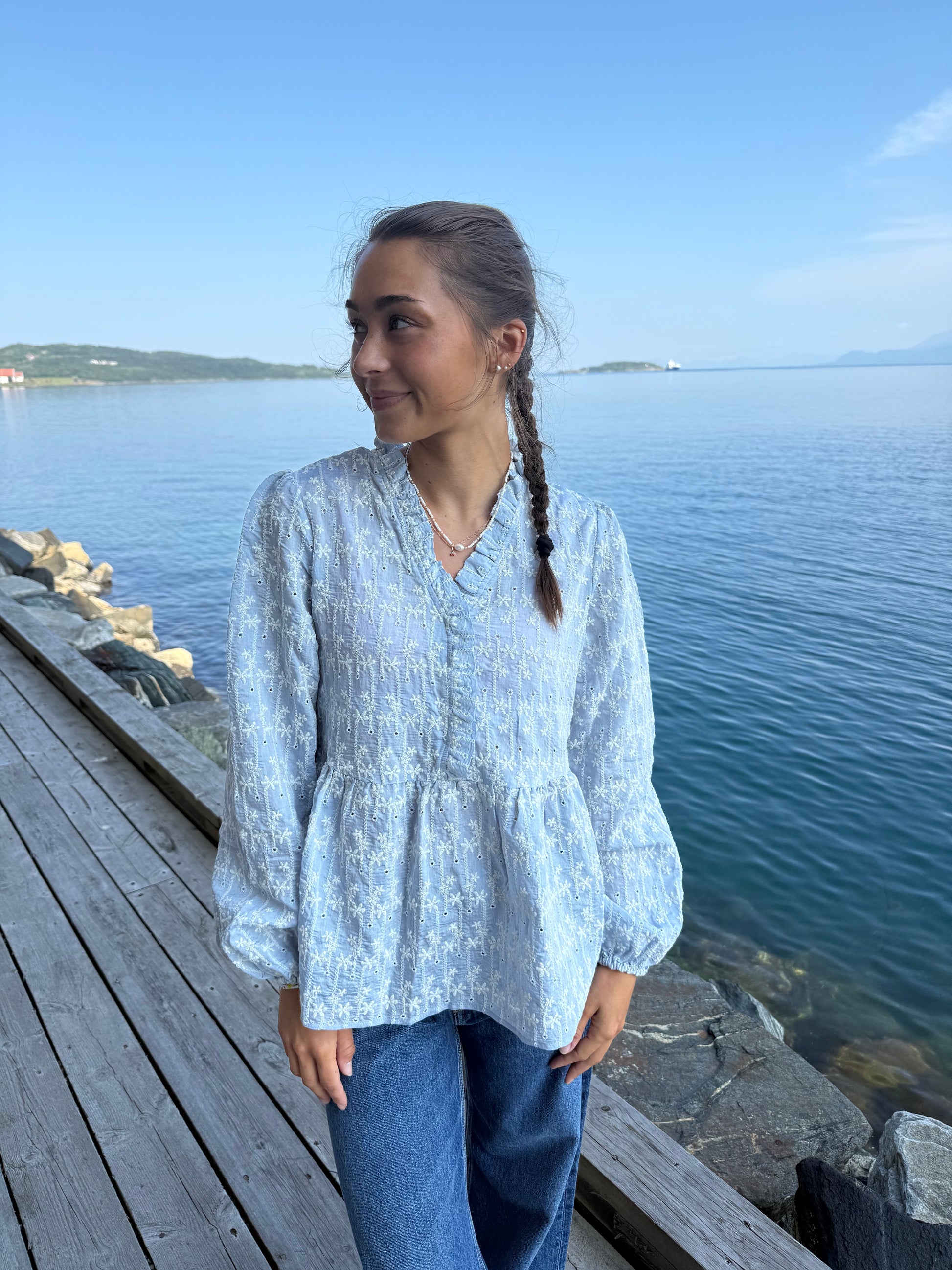 Elegant bluse fra Noella med flatterende V-hals med delikate deltajer. Designet med fokus på midjen og en liten grad av peplum. Modellen er 170 cm og har på seg størrelse S.