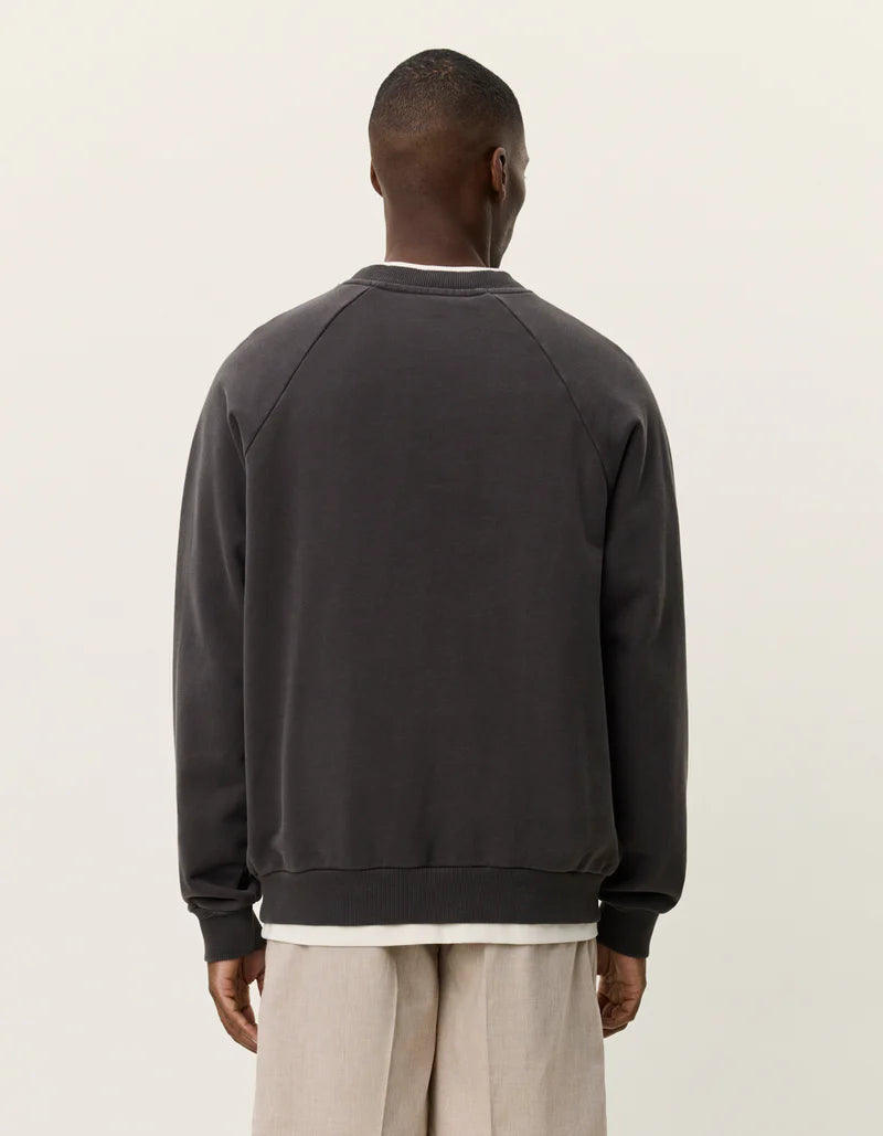 En avslappet crewneck i loopback terry med slitt, innvasket finish. Det lille kontrast brysttrykket holder det minimalistisk, mens teksturen gir særpreg.