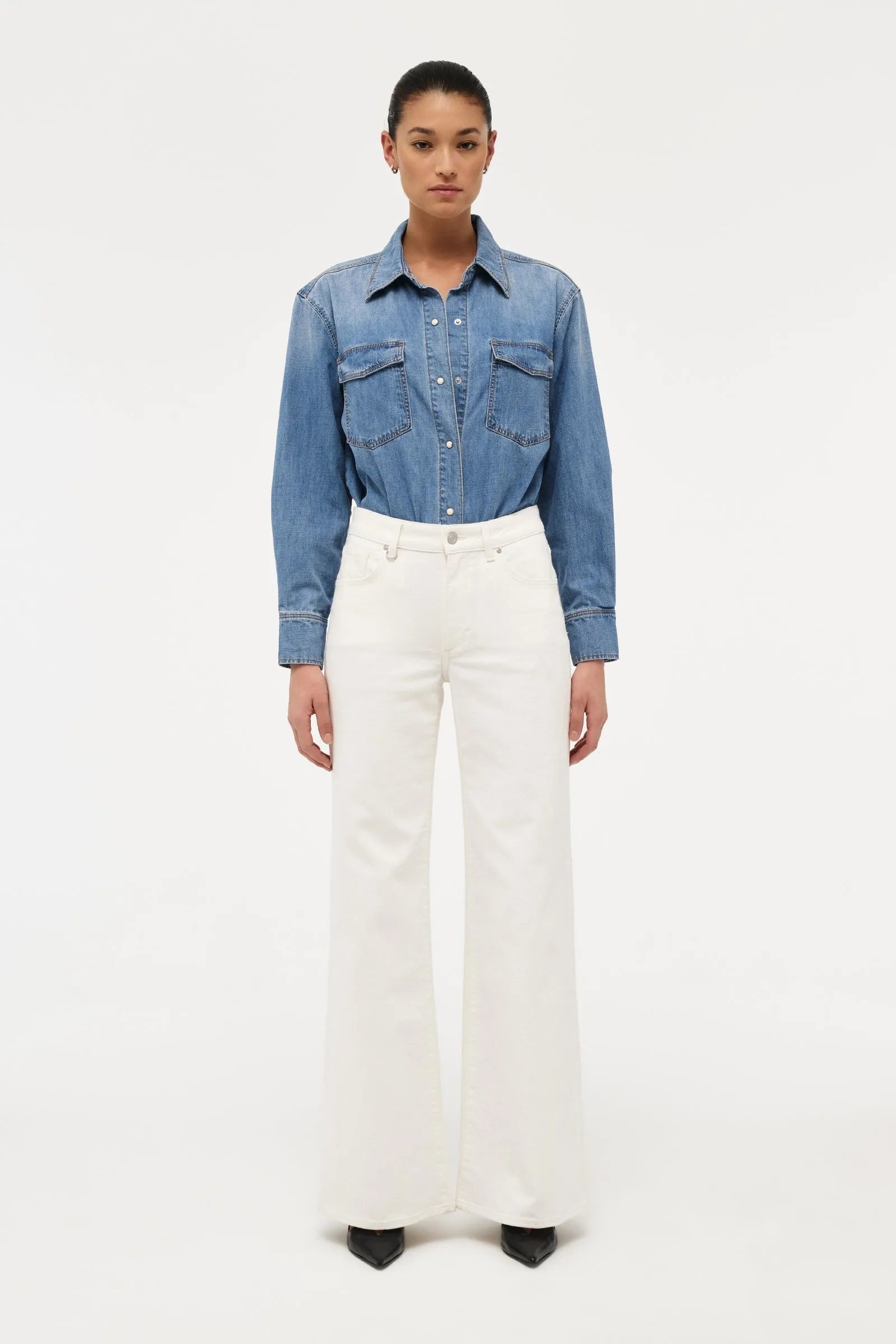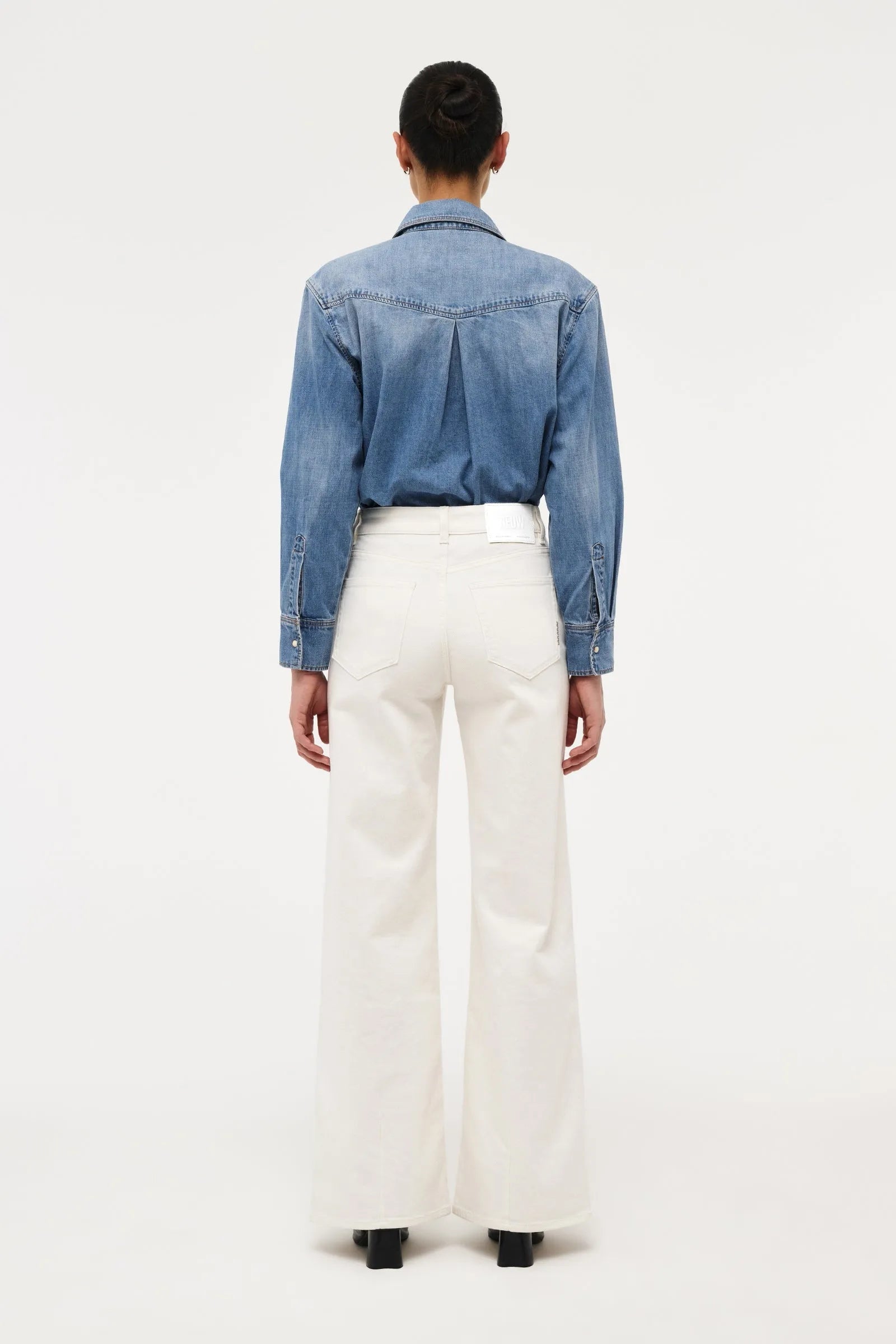 Disse vide, hvite jeansene har mid waist og en flatterende lang benlengde. De er tettsittende over midje, hofter og lår, og faller løst fra midten av låret for en elegant vid silhuett. Dette er en klassisk jeans som gir en flatterende silhuett.