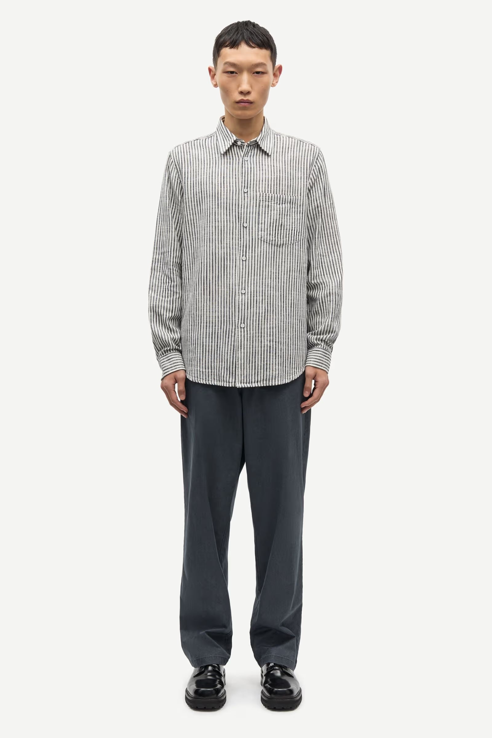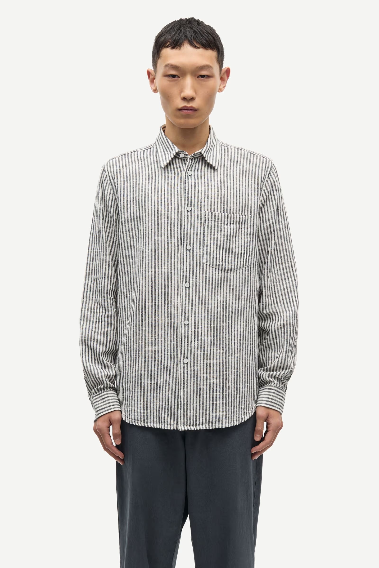 Style SAMAC LONG-SLEEVED STRIPED SHIRT med chinos, lette bukser eller jeans for en sofistikert, men avslappet stil. En allsidig skjorte som kombinerer komfort, moderne detaljer og klassisk design.