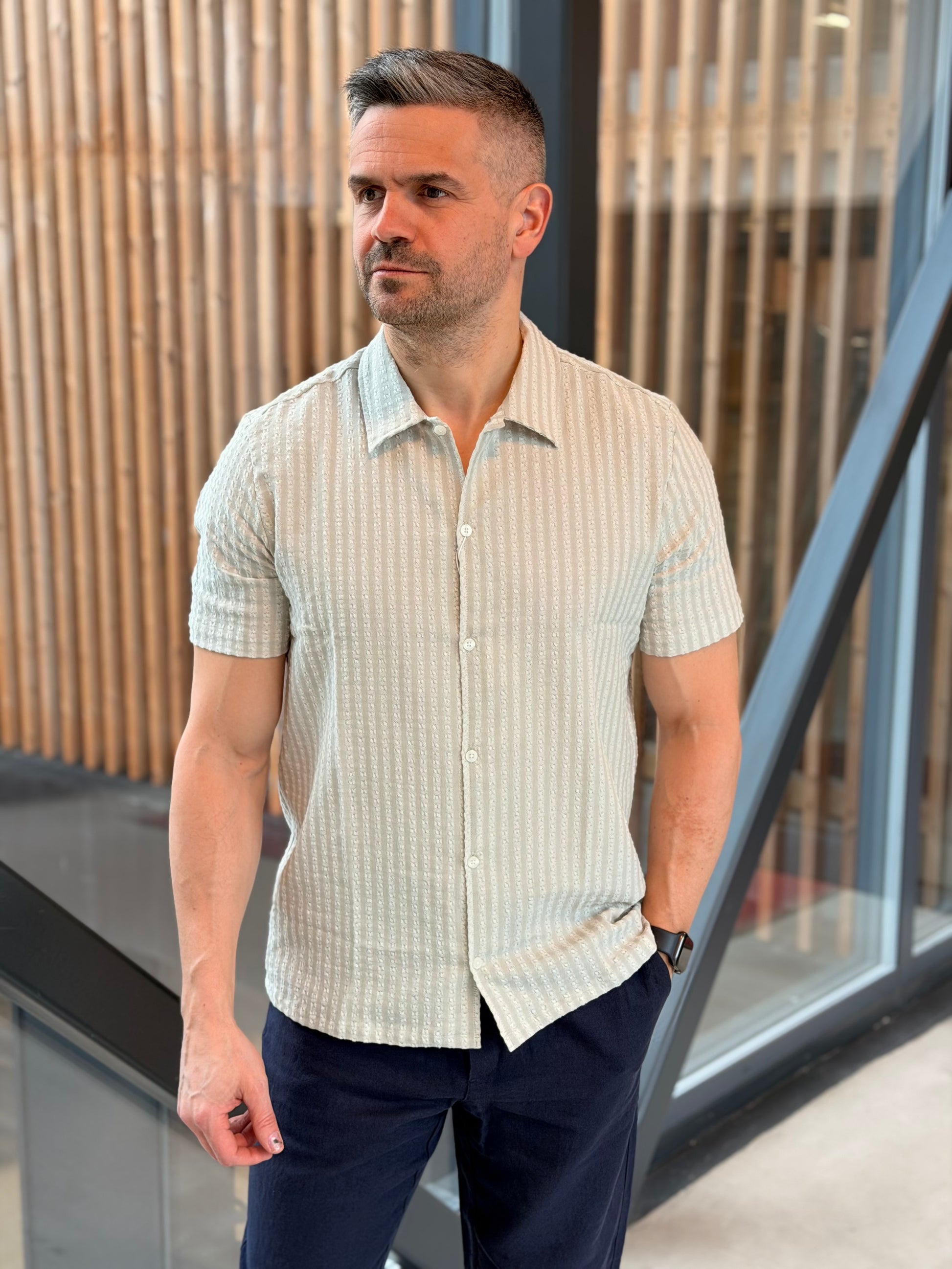 Kortermet skjorte med subtilt mønster. Skjorten lukkes med knapper i front og har normal passform. Vevd i Portugal av elastisk bomull.