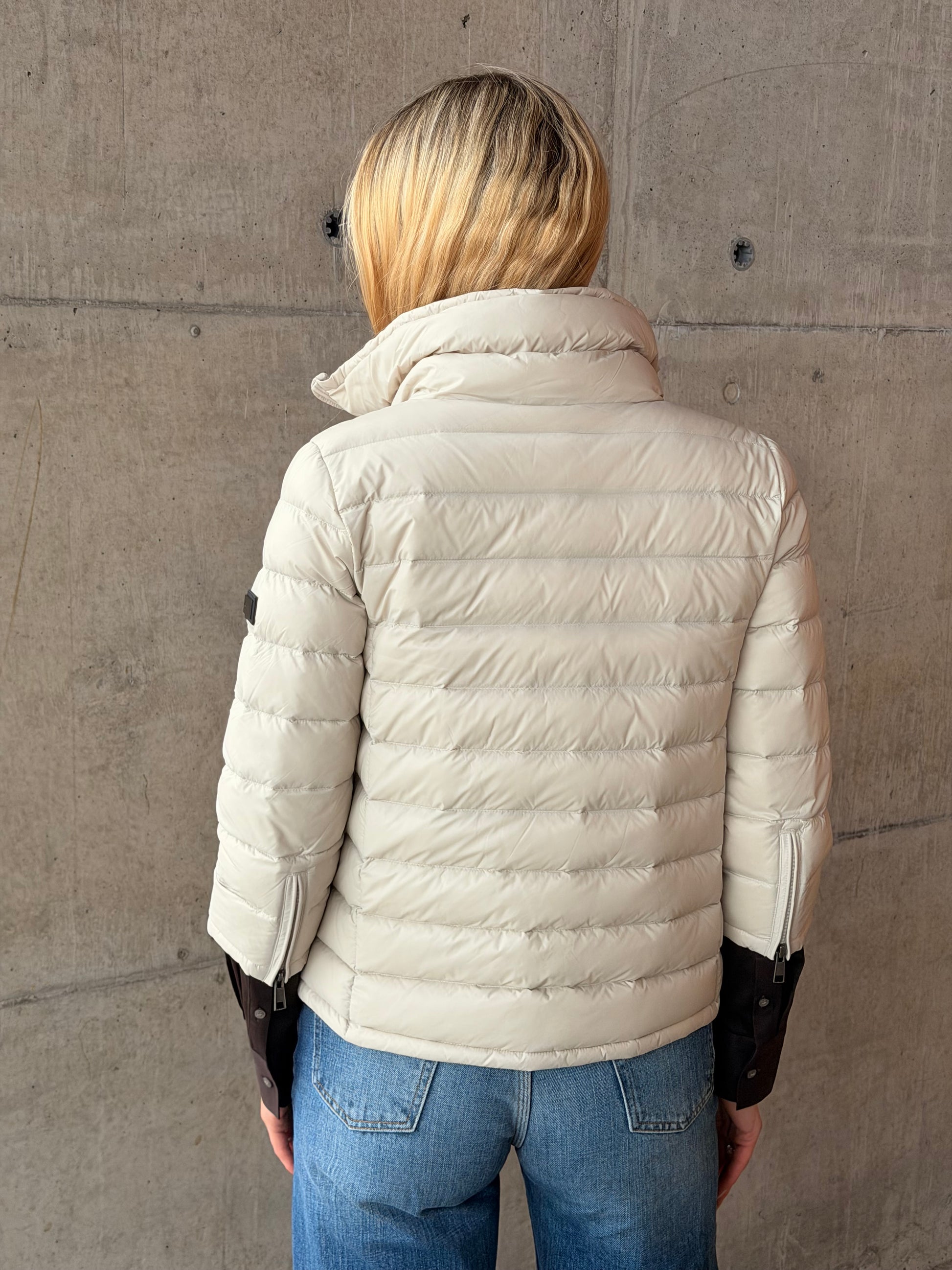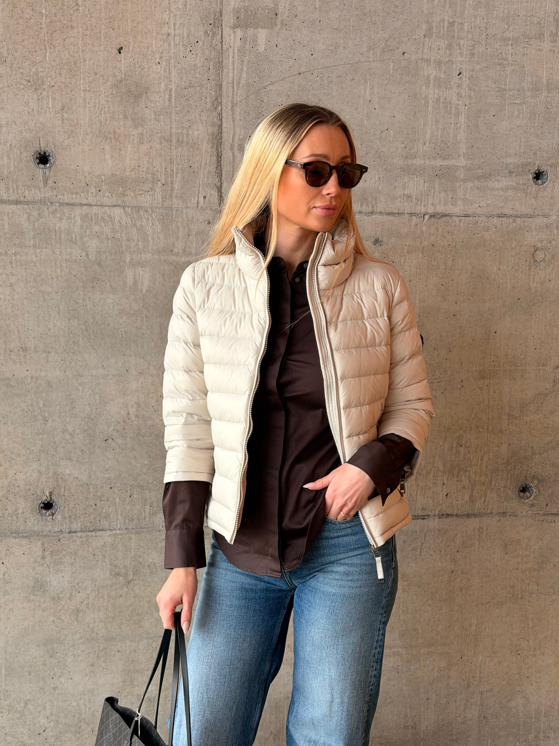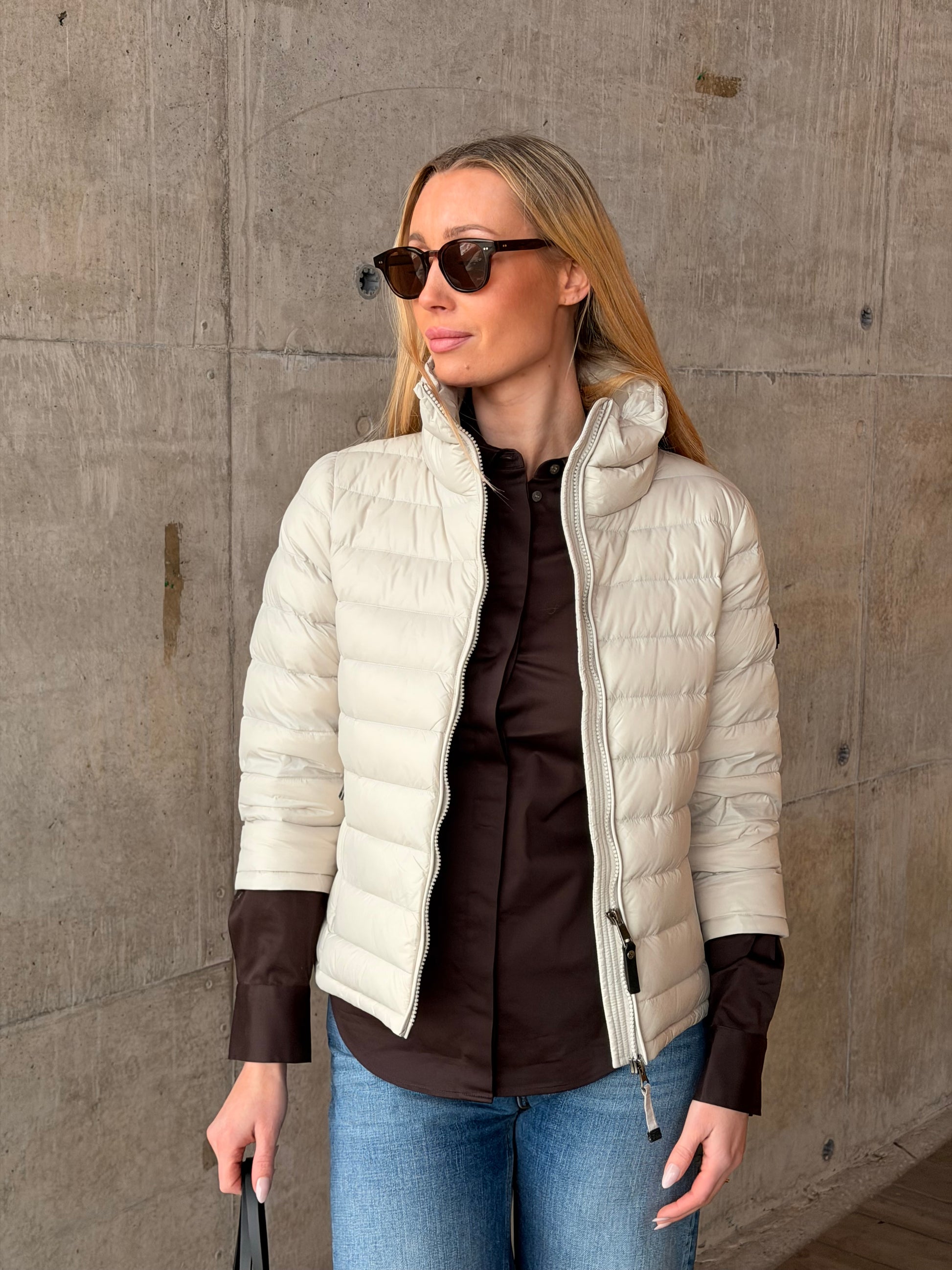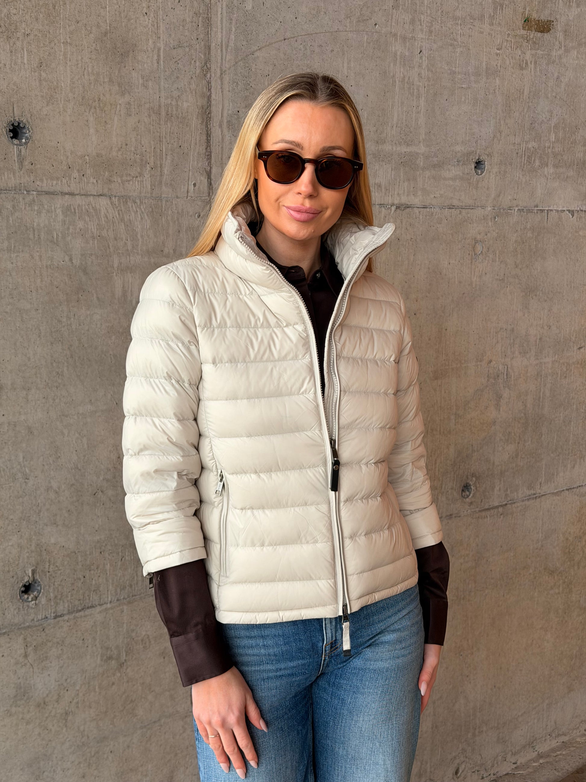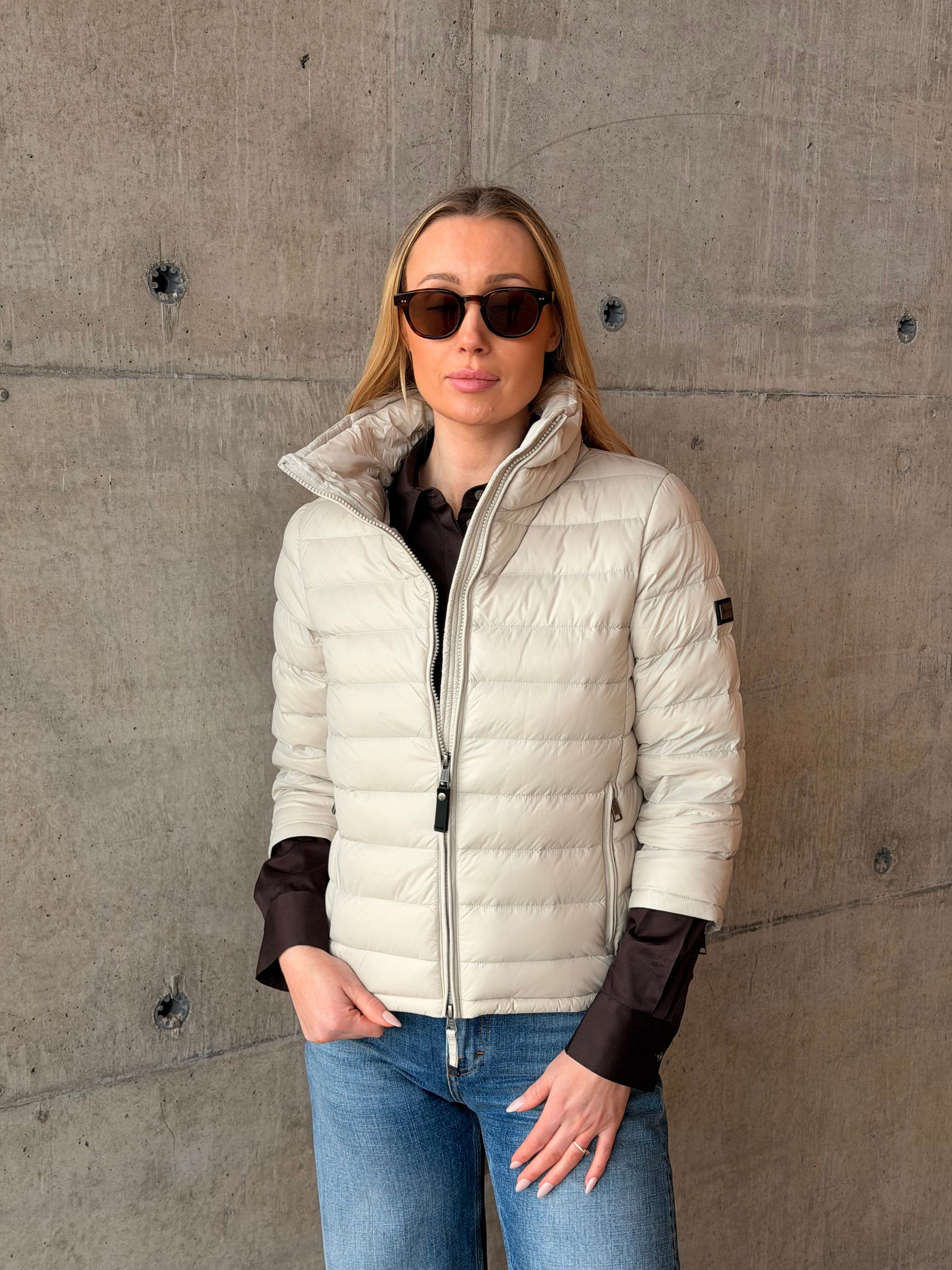 Jakken har høy hals som gir et rent og sofistikert uttrykk, og en praktisk to-veis glidelås i front som gir fleksibilitet i bruk. Sidelommer med glidelås sørger for trygg oppbevaring av småting når du er på farten.