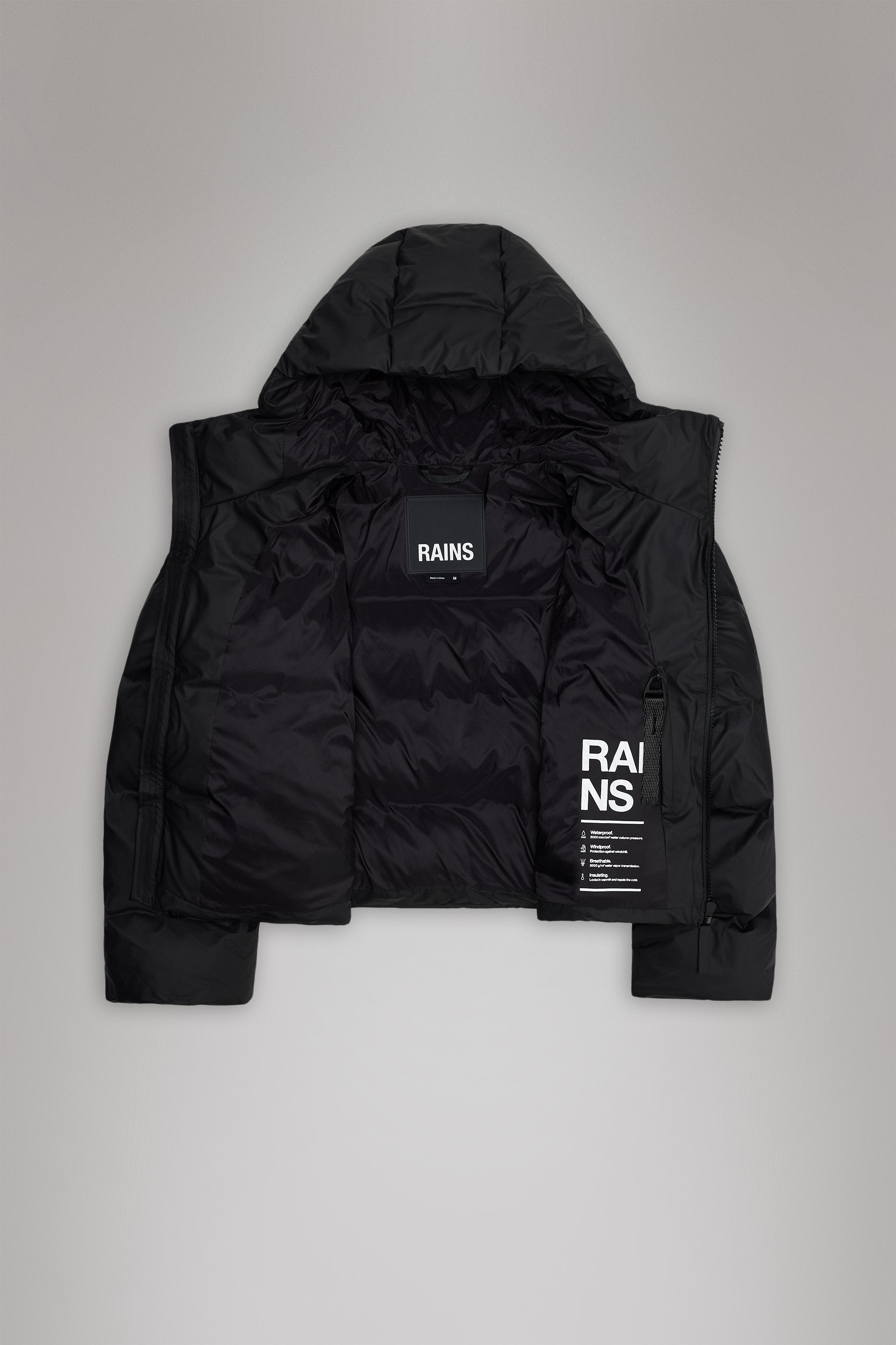 Denne stilrene pufferen er bygget med vevd kammerteknologi og laget av Rains’ signatur-PU-materiale med doble, sveisede sømmer. Overflaten er lett og har en glatt finish.