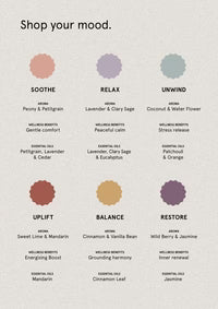 En serie med velværedufter og kroppspleieprodukter som støtter sinn, kropp og sjel. Serien består av syv stemningsskapende aromaer – utviklet for å løfte, roe ned, balansere og inspirere. Hver duft er infusert med rene eteriske oljer og nøye sammensatte duftelementer som gir deg aromaterapi i hverdagen.