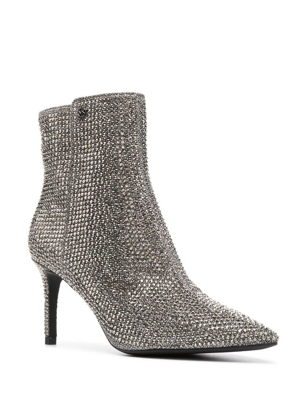 Rålekre støvletter fra Michael Kors dekket i dekorative krystallsteiner, som reflekterer lys. Med disse på fanger man blikket til alle tilstede. Støvlettene har spiss tå, stiletthæler og polert MK-logo i sølv.